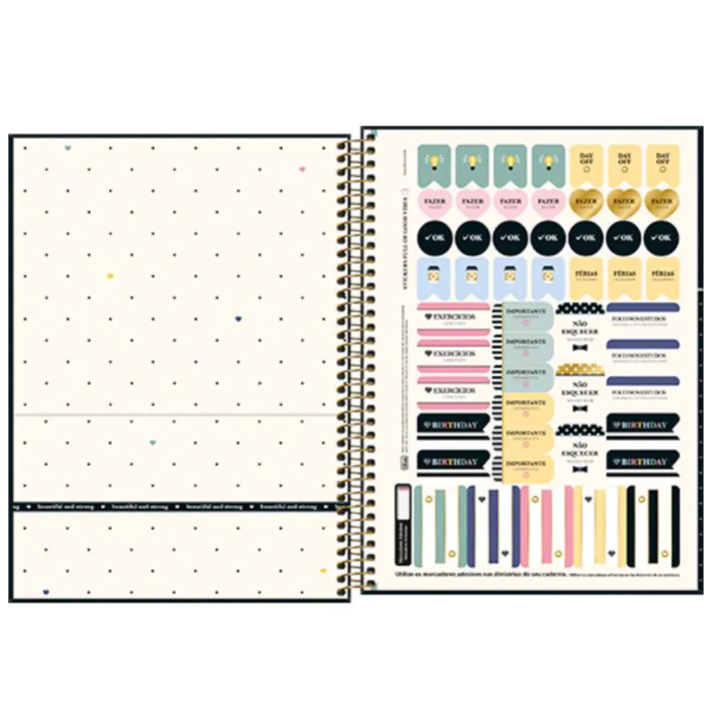 Caderno Espiral Capa Dura Universitário 10m West Village 160 Folhas 340782 TILIBRA combina organização e elegância para o dia a dia na escola ou universidade. Possui capa dura decorada com detalhes metalizados, parte interna ornamentada, espiral colorido, 10 divisórias decoradas, folhas pautadas (160 folhas, 56 g/m²), bolsa de papel para guardar anotações e folha de adesivos funcionais. Formato universitário (aprox. 20 × 27,5 cm) oferece amplo espaço para anotações. Produto certificado FSC, ideal para estudantes que valorizam estilo e praticidade.